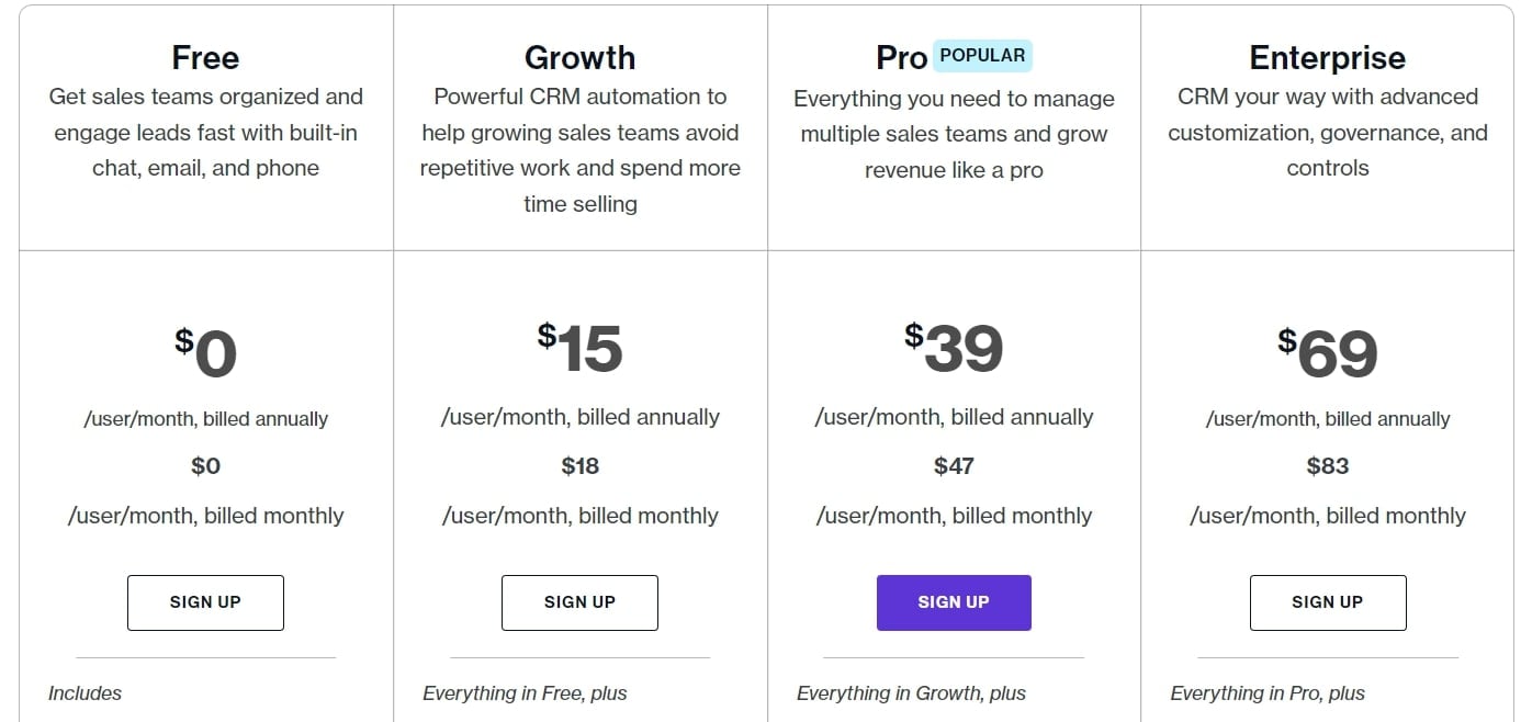 - Free(最多兩個用戶):訪問網絡到潛在客戶捕獲表單、協作工具、自定義通知和基本 CRM 工具。